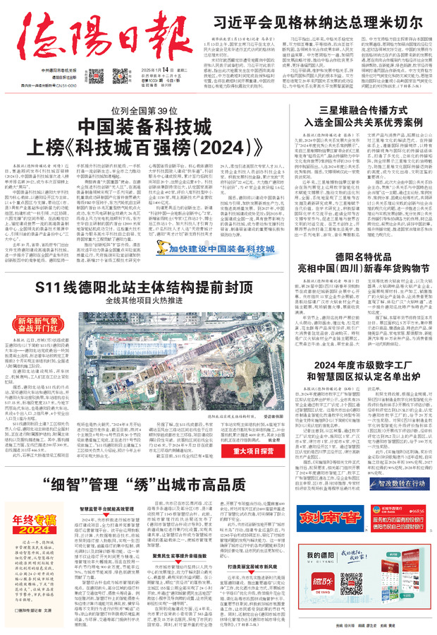 习近平会见格林纳达总理米切尔 中国装备科技城 上榜《科技城百强榜(2024)》 三星堆融合传播方式 入选全国公共关系优秀案例 S11线德阳北站主体结构提前封顶 德阳名特优品 亮相中国(四川)新春年货购物节 2024年度市级数字工厂 和智慧园区拟认定名单出炉 “细智”管理 “绣”出城市高品质