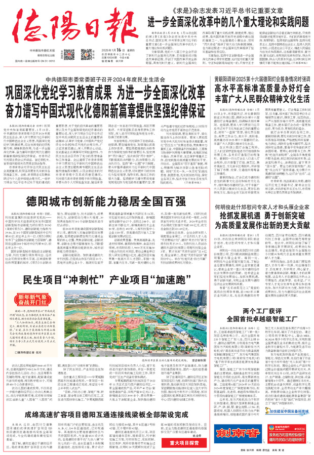 进一步全面深化改革中的几个重大理论和实践问题 巩固深化党纪学习教育成果 为进一步全面深化改革奋力谱写中国式现代化德阳新篇章提供坚强纪律保证 高水平高标准高质量办好灯会 丰富广大人民群众精神文化生活 德阳城市创新能力稳居全国百强 抢抓发展机遇 勇于创新突破 为高质量发展作出新的更大贡献 民生项目“冲刺忙” 产业项目“加速跑” 两个工厂获评 全国首批卓越级智能工厂 成绵高速扩容项目德阳互通连接线梁板全部架设完成