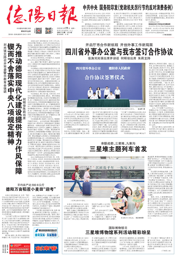 中共中央 国务院印发《党政机关厉行节约反对浪费条例》 锲而不舍落实中央八项规定精神 为推动德阳现代化建设提供有力作风保障 四川省外事办公室与我市签订合作协议 德阳万亩稻茬小麦田“迎考” 三星堆主题列车首发 三星堆博物馆系列活动精彩纷呈